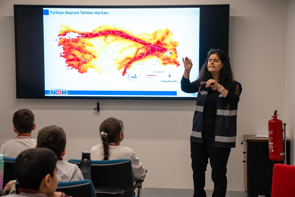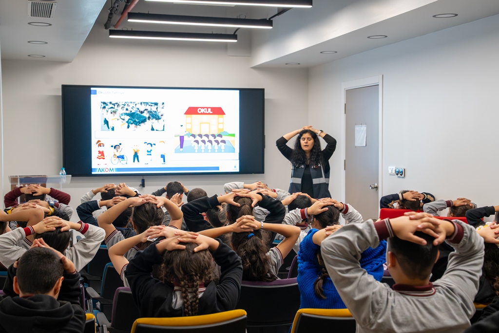 Afet Koordinasyon Merkezinde (AKOM) 5. ve 6. sınıflarda eğitim gören öğrencilere yönelik düzenlenen seminerlerde güvenli yaşam ve afet bilinci oluşması amaçlanırken, eğitimlerde maksimum sayıda öğrenciye ulaşılması hedeflenmektedir.