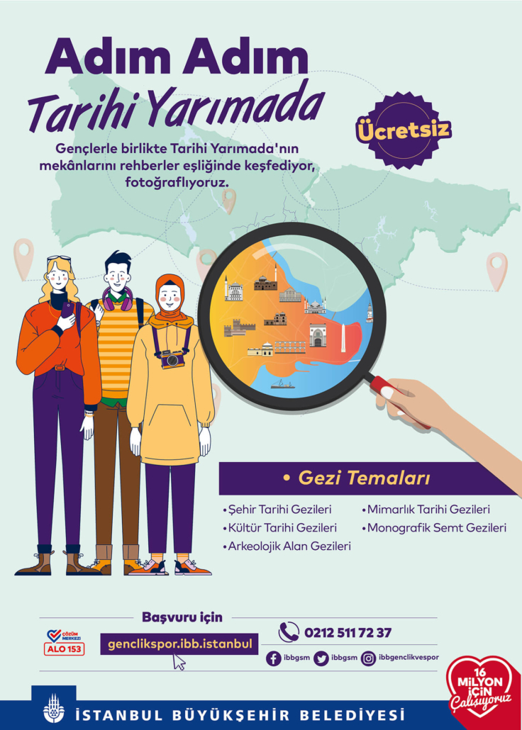 İstanbul Büyükşehir Belediyesi şehrin tarihini, geçmişten gelen zengin birikimini ve geleneksel yaşam kültürünü İstanbullu gençlerle buluşturacağı Adım Adım Tarihi Yarımada Projesini hayata geçirdi. Katılım başvurularının genclikspor.ibb.istanbul adresinden alındığı proje kapsamında 19 farklı rotadan oluşan tur programları düzenlenecek. 15 – 29 yaş arası gençlere hitap eden proje ile sanat tarihi uzmanları ve rehberler rota üzerindeki noktaları ayrıntılı olarak gençlere anlatacak.