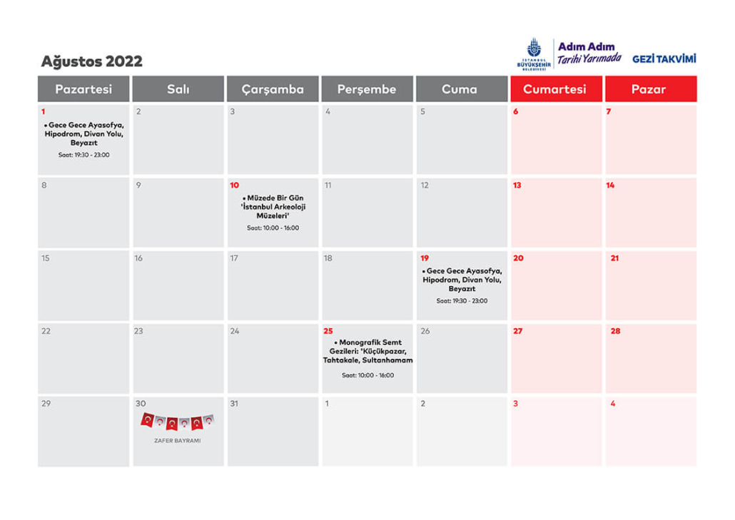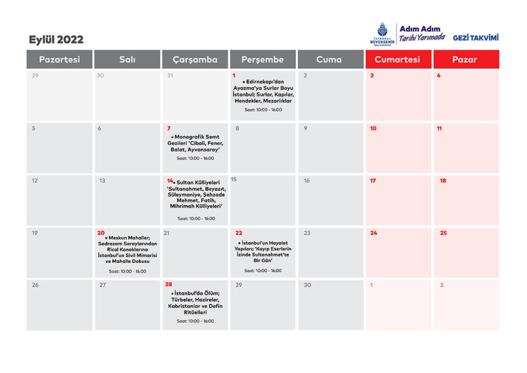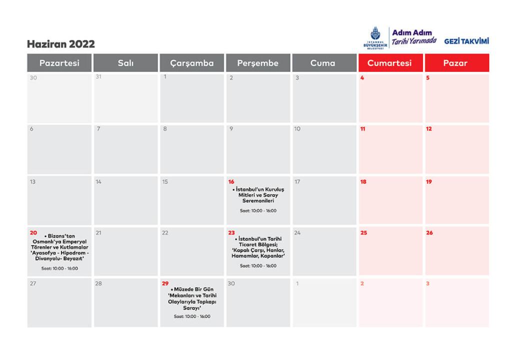 İstanbul’un sakinleri ve varisleri olmanın ayrıcalığını yaşatmayı hedefleyen proje İstanbul’un kadim tarihini, zengin birikimini ve geleneksel yaşam kültürünü gençlerle buluşturacak. Adım Adım Tarihi Yarımada Projesi’ne katılacak olan gençler için kültür tarihi gezileri, mimarlık tarihi gezileri, monografik semt gezileri, arkeolojik alan gezileri ve müze gezileri olmak üzere beş farklı kategoride şehir turları düzenlenecek. Turların ilk 16 Haziran’da Yarımada’da ‘İstanbul’un Kuruluş Mitleri ve Saray Seremonileri” temasıyla düzenlenecek.