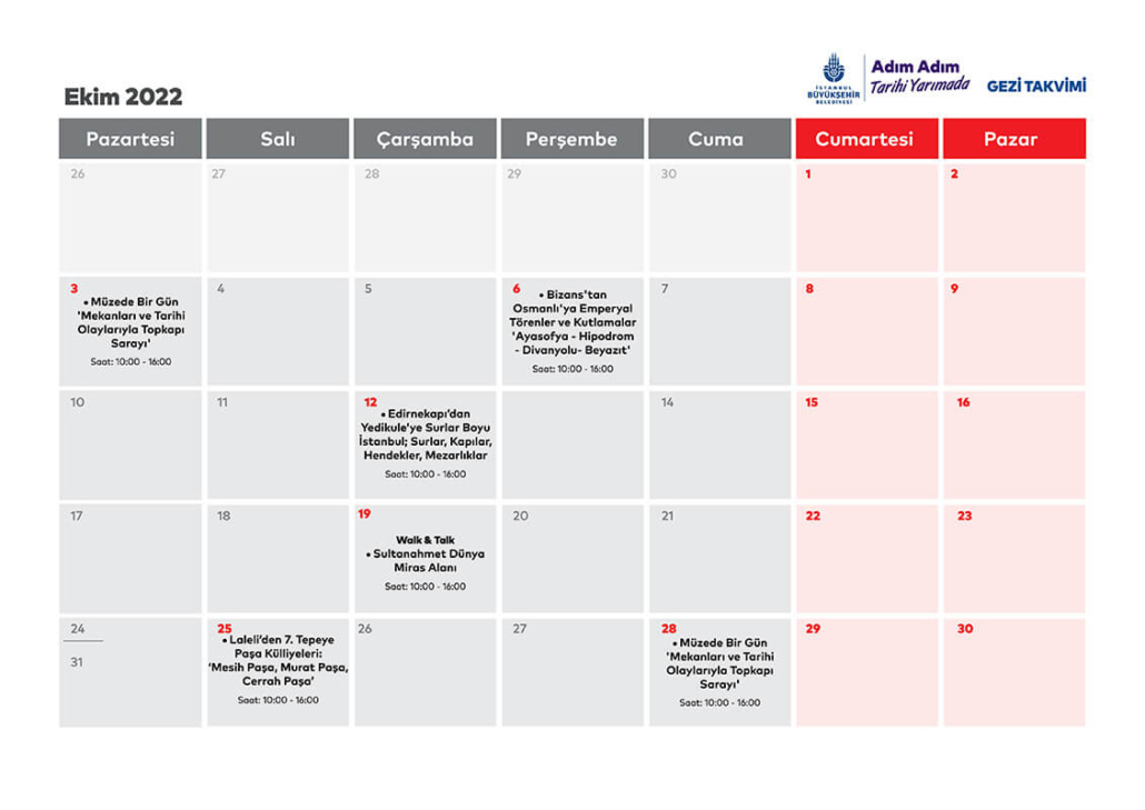 19 farklı rotayı içeren turlar kapsamında alanında uzman sanat tarihçileri ve rehberler birbirinden farklı tematik başlıklarla İstanbul’u gençlere anlatacak. 25-30 kişilik gruplarla yıl boyunca devam etmesi planlanan projede Bizans’tan Osmanlı’ya Emperyal Törenler ve Kutlamalar teması ile Ayasofya, Hipodrom, Divanyolu, Beyazıt Turu; Edirnekapı’dan Yedikule’ye İstanbul’un Kara Surları;  Mekanları ve Tarihi Olaylarıyla Topkapı Sarayı, Türk ve İslam Eserleri Müzesi ve İstanbul Arkeoloji Müzesi’nin de aralarında olduğu Müzede Bir Gün; Küçükpazar, Süleymaniye, Vefa ve Zeyrek gibi lokasyonları içeren Semt Gezileri öne çıkan rotalar olarak dikkat çekiyor.