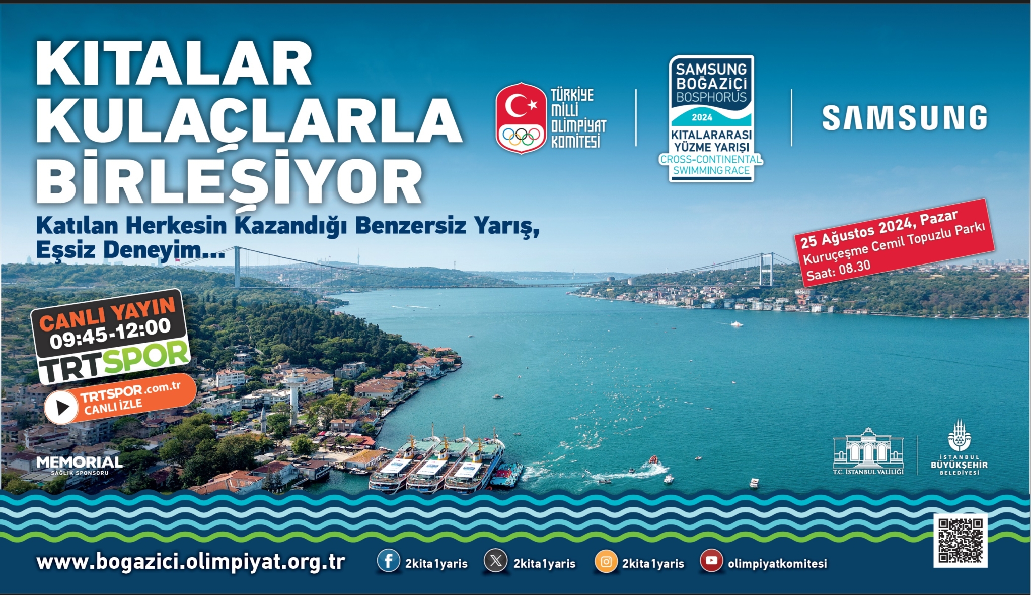 Samsung Boğaziçi Kıtalararası Yüzme Yarışı dünyada kıtaları kulaçlarla birleştiren tek yarış olma özeliği taşıyor. Her yıl Türkiye’den ve dünyanın dört bir yanından binlerce kişinin başvurduğu yarış TMOK tarafından 25 Ağustos’ta 36’ncı kez düzenlenecek.