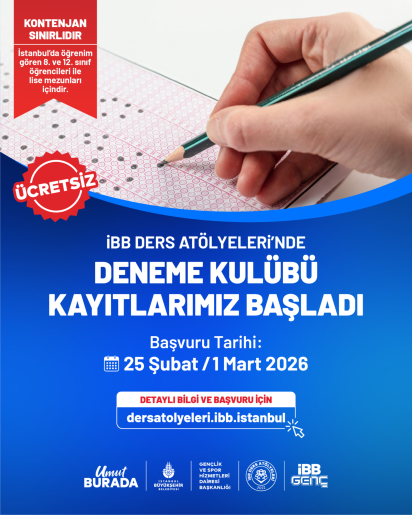 İBB Deneme Kulübü’nün başvuruları başladı. Denemelere katılmak isteyen öğrenciler 1 Mart’a kadar Ders Atölyelerinin https://dersatolyeleri.ibb.istanbul/ web adresi üzerinden başvurabilecek.